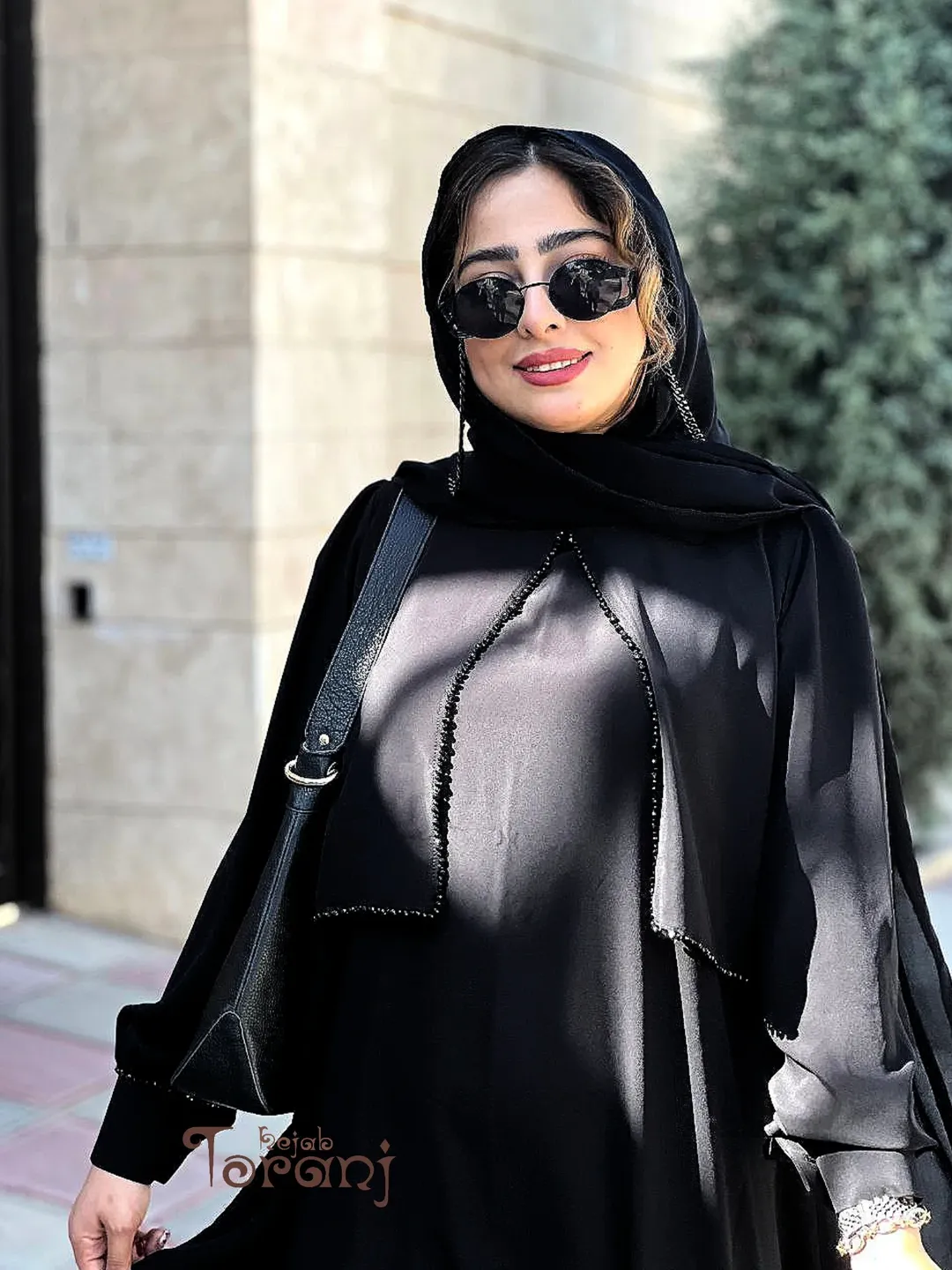 عبای نورا با جنس الیزه ی درجه ی یک و قابلیت سفارشی شدن در قد و رنگهای متنوع همچون مشکی، طوسی، سبز زمردی، نسکافه ای و سورمه ای.